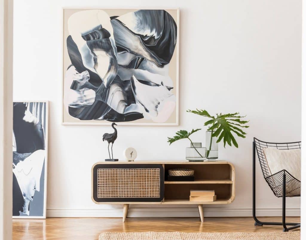 Incorporating personal art and carefully chosen decor, this living space exudes personality and creativity, showcasing a balance between modern and organic design elements.