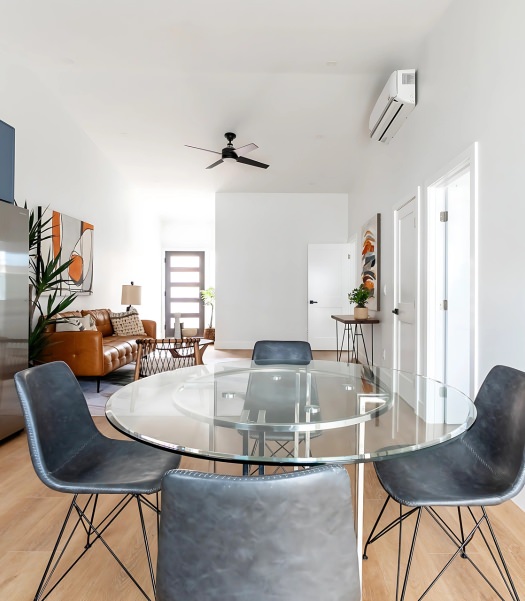 Use an open floor plan, big windows, and light colors to make it feel roomy. Built-in storage and multi-use furniture, like a kitchen island with seating, can help maximize space.