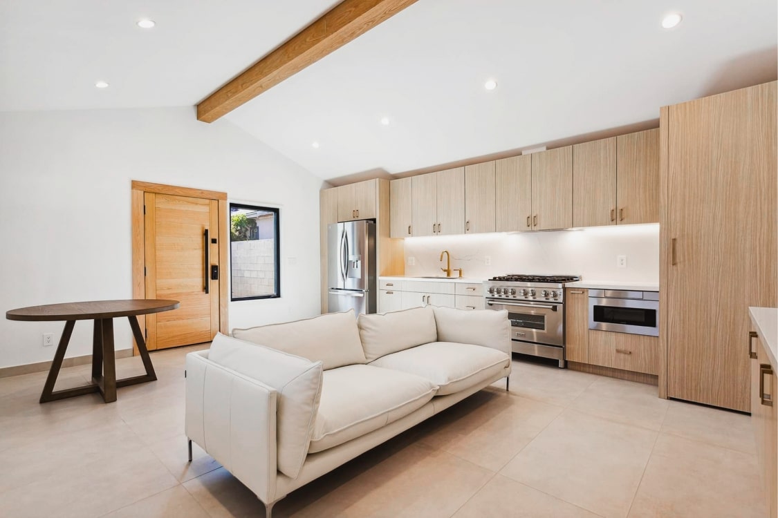 Bright and modern garage conversion ADU featuring a cozy living area with a sleek white couch, a spacious kitchen with light wood cabinets, stainless steel appliances, and a dining table, all illuminated by recessed lighting and accented with wooden beams.